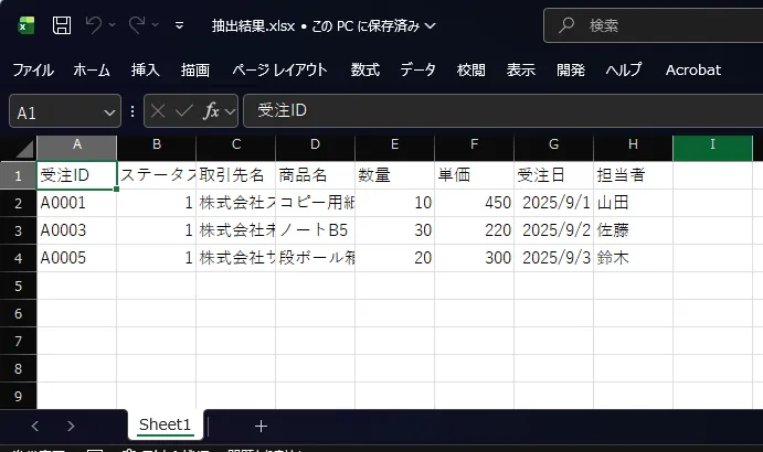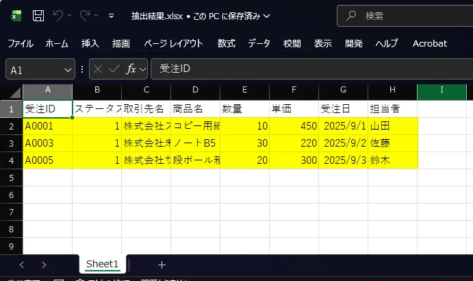 今回は例として、「抽出結果.xlsx」というファイル名で保存します。