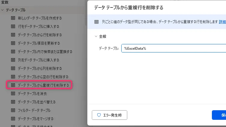 Power Automate Desktop:データテーブルから重複行を削除する アクション使用