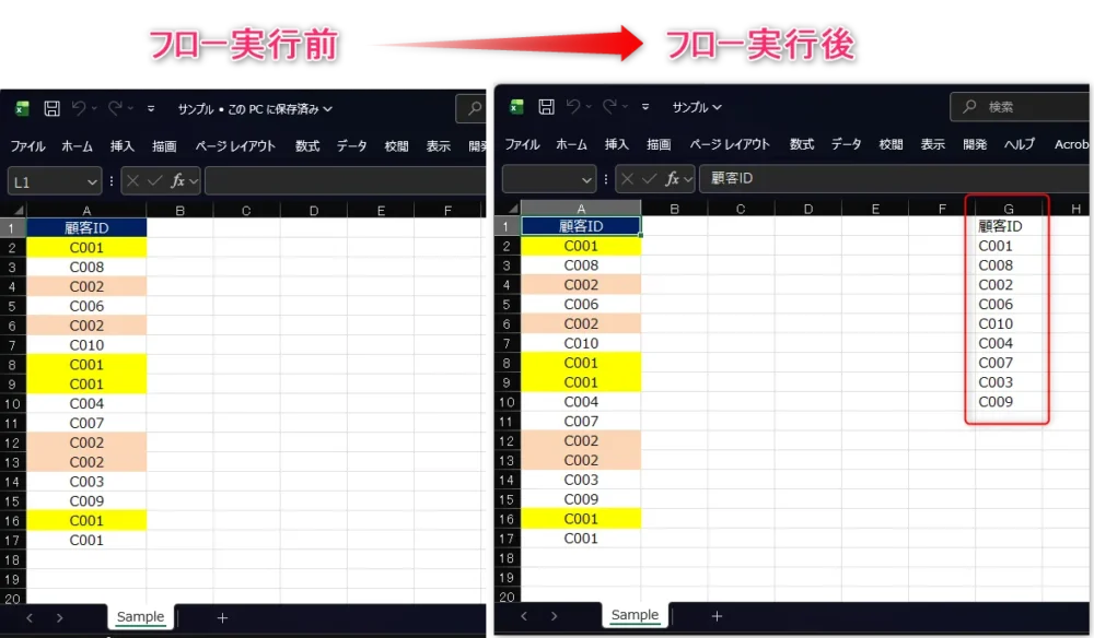 処理後の Excel ファイルでは、日付・顧客ID・商品コードの3列を基準に