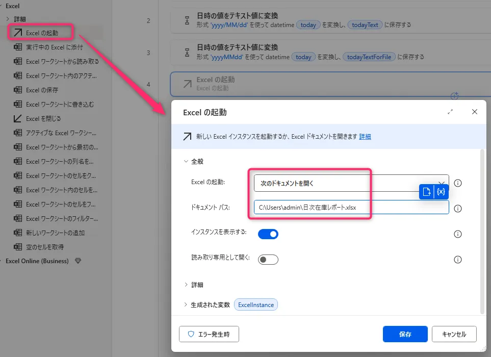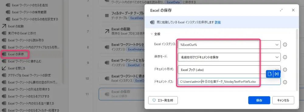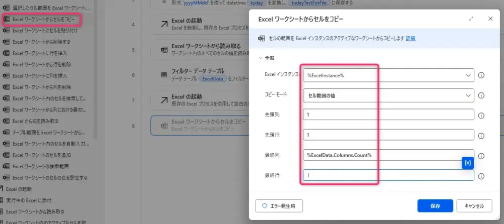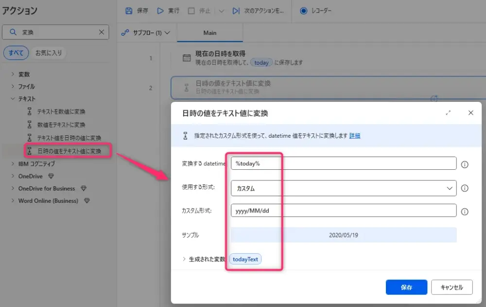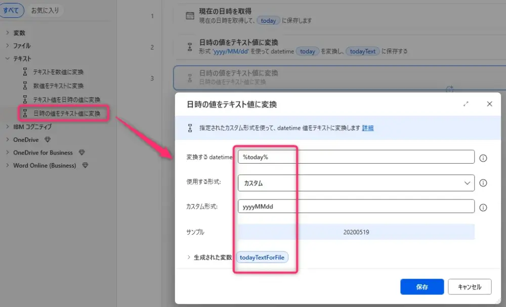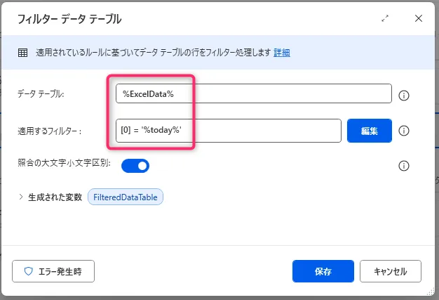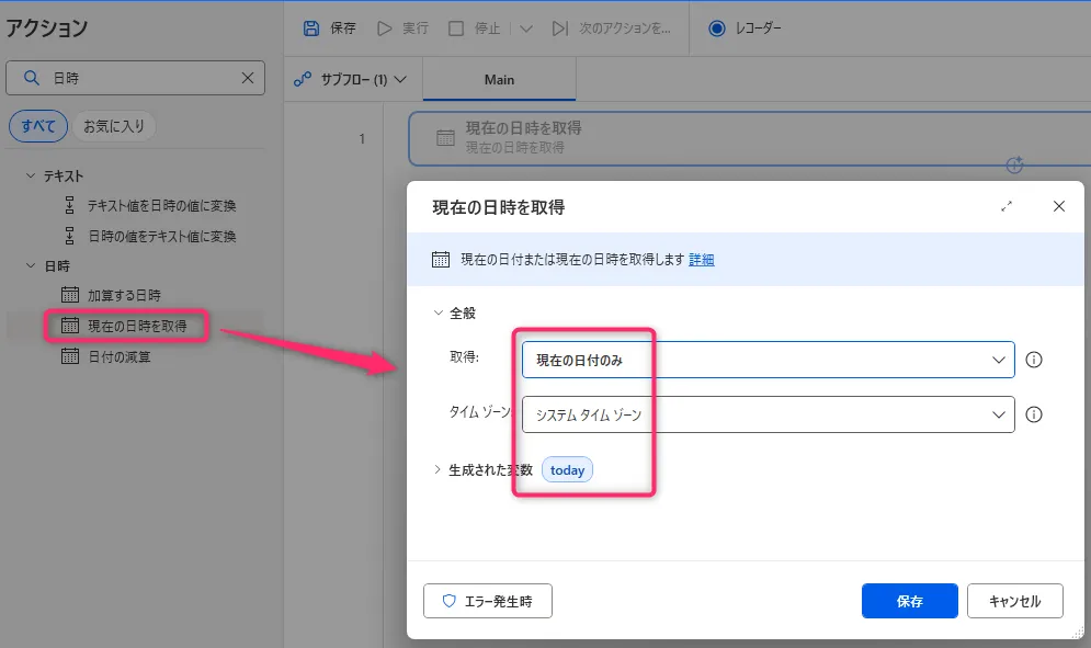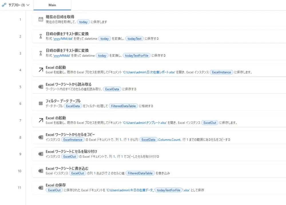 今日の日付だけを抽出して別ファイルにまとめる フローを作成します。