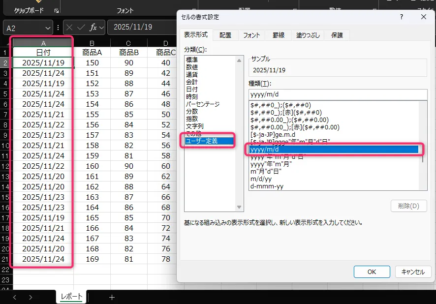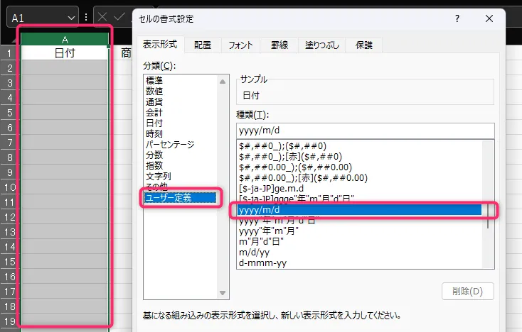 1列目の「日付」列は、Excel のセル書式が ユーザー定義(yyyy/m/d)」 に設定されています。