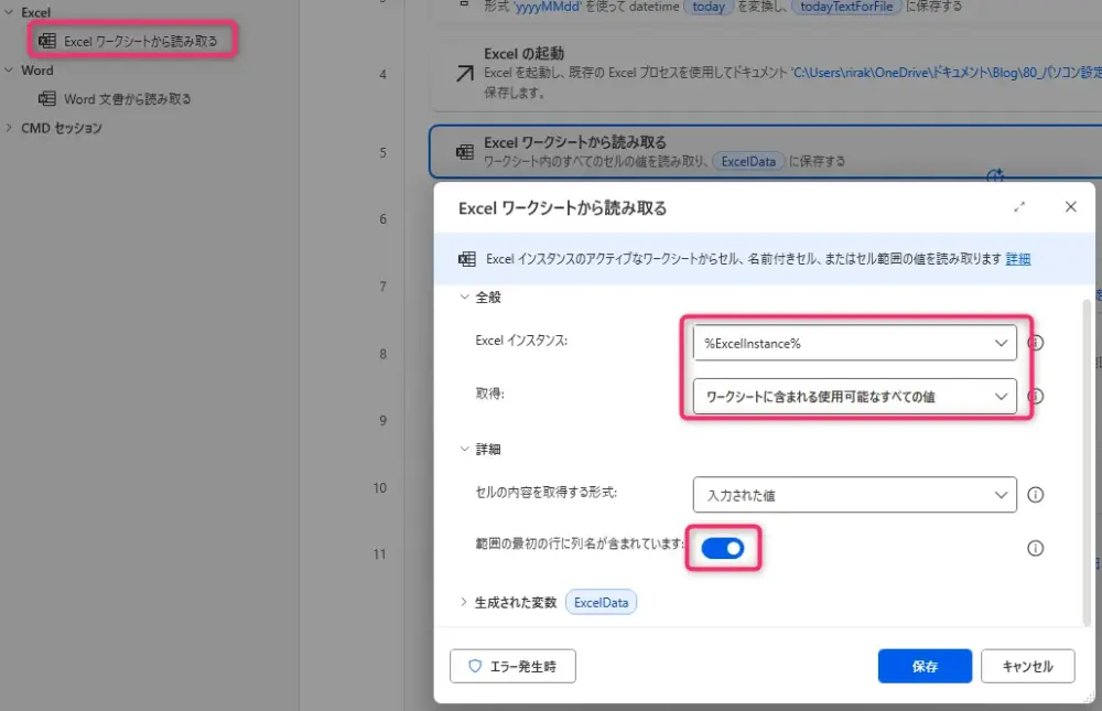 Power Automate Desktop は自動でヘッダーを生成しないため、
