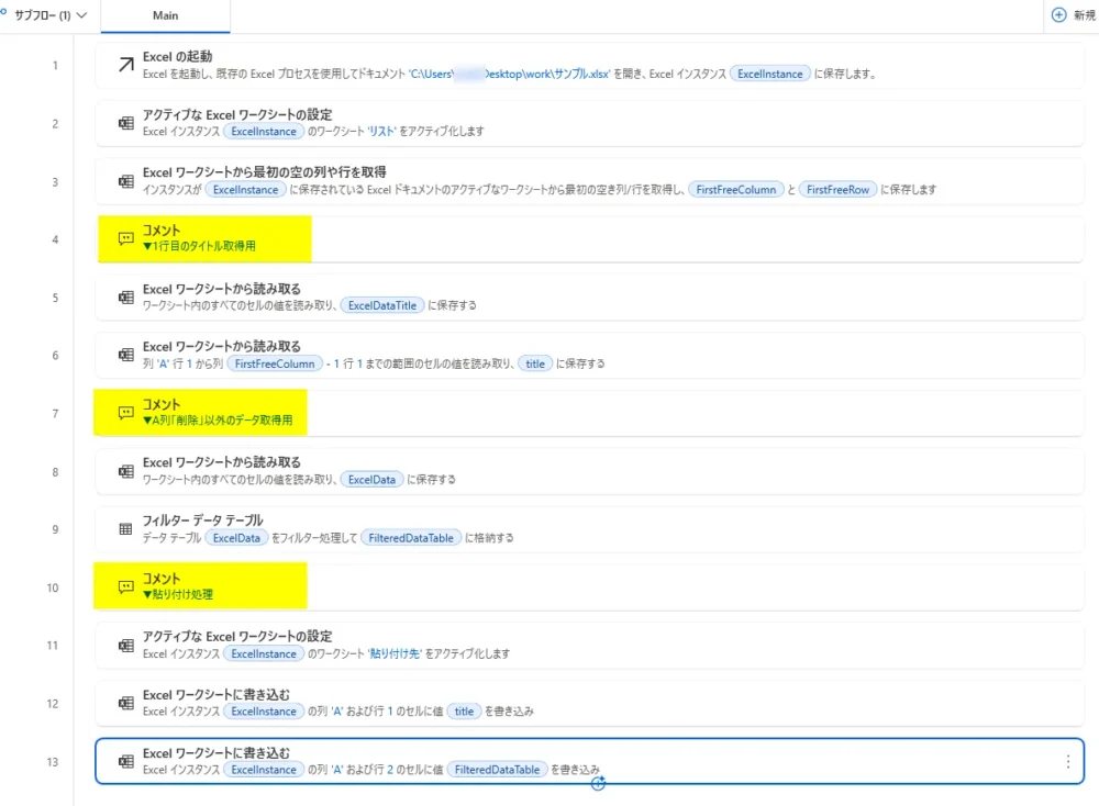 読み取ったExcelデータ(%ExcelData%)から必要な行だけを抽出します。