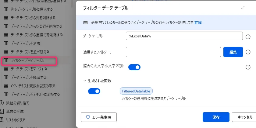 ここでは「フィルター データ テーブル」を使って、
