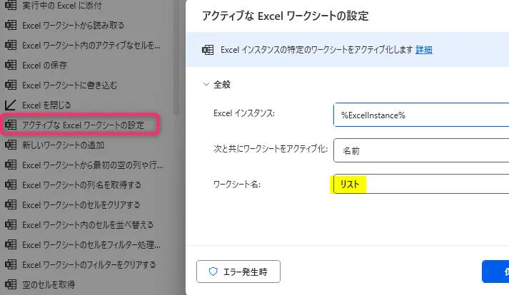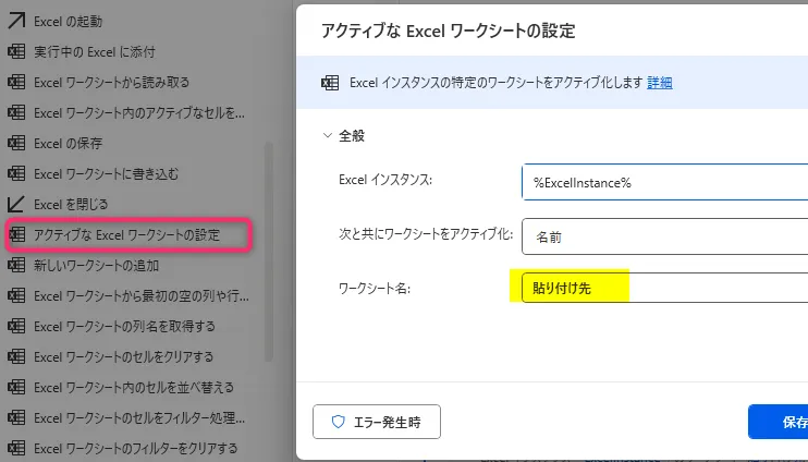 2. 「アクティブな Excel ワークシートの設定」