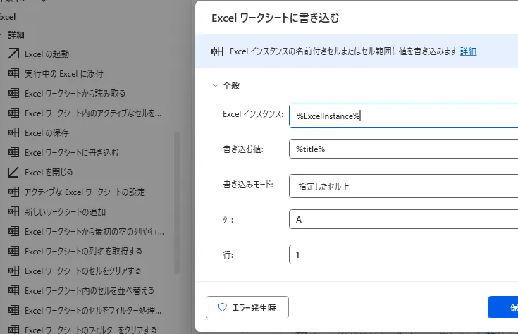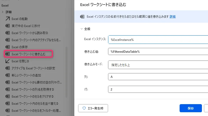 10. 「Excel ワークシートに書き込む」
