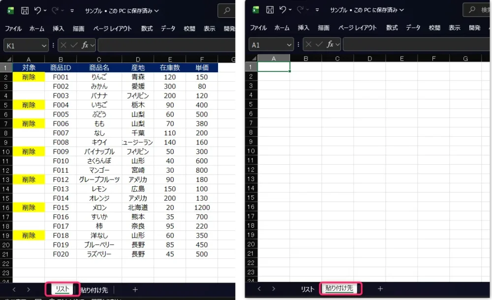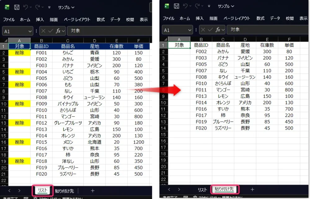 それ以外の行だけが「貼り付け先」シートに反映されます。