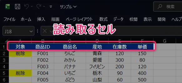Excelの1行目(項目名)だけを読み取ります。
