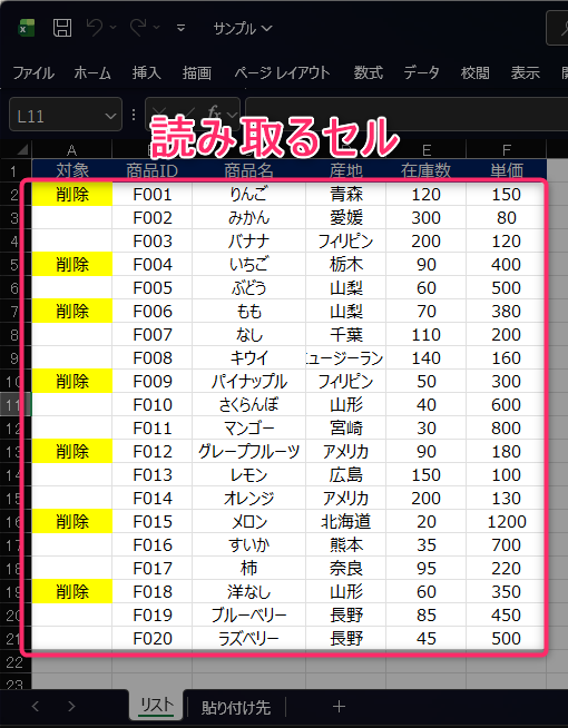 「リスト」シートのA列に「削除」が入力されている行を除外し、