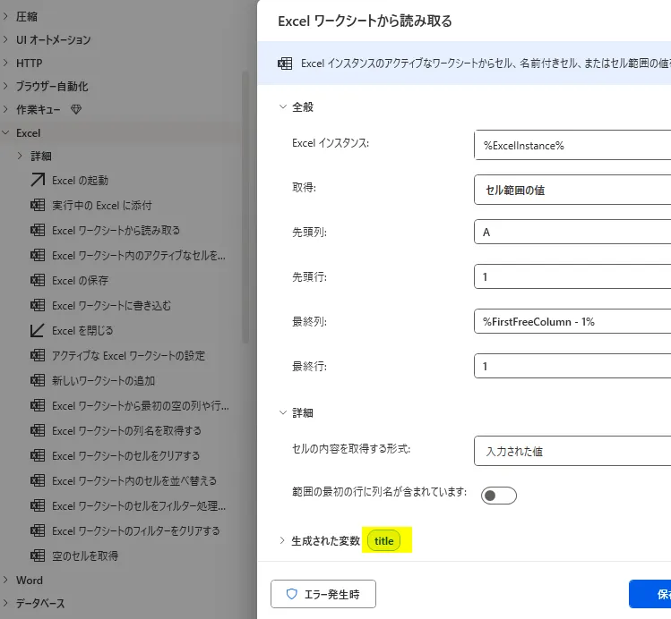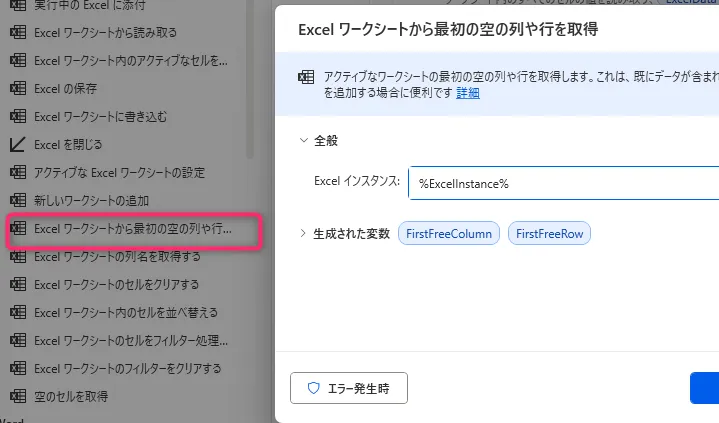 3. 「Excel ワークシートから最初の空の列や行を取得」
