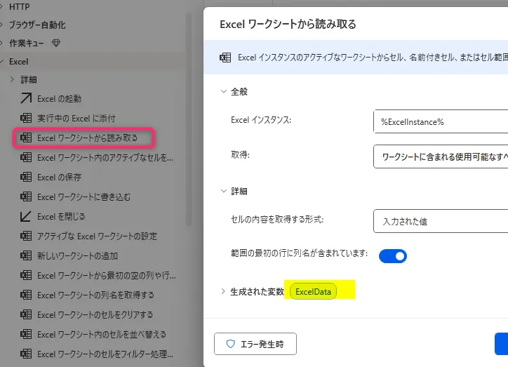 5. 「Excel ワークシートから読み取る」