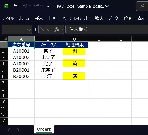 IF 条件が True の場合、C 列(処理結果)に「済」と書き込みます。