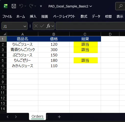 商品名に「りんご」が含まれる場合のみ、C列に 「該当」 という文字を自動で書き込みます。