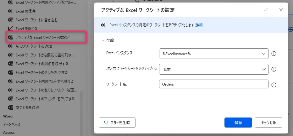 今回は 「Orders」シートを使用するため、ワークシート名:Orders を選択します。