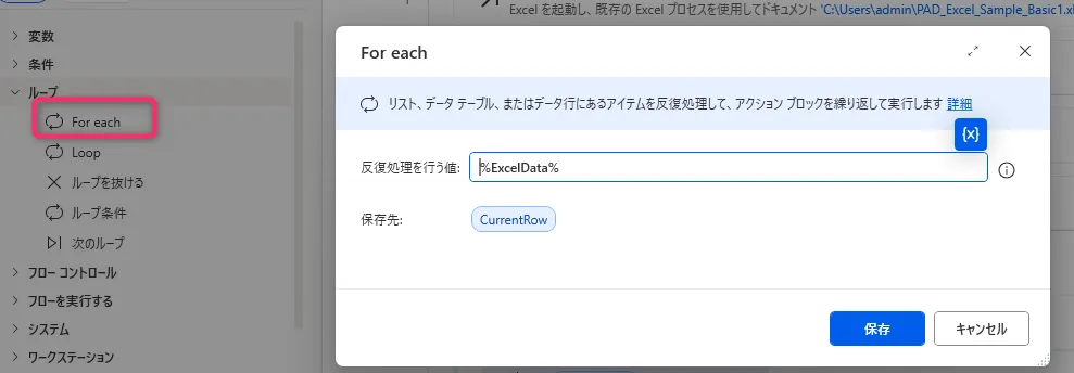 ExcelData を 1 行ずつ処理する ため、「For each」を使います。