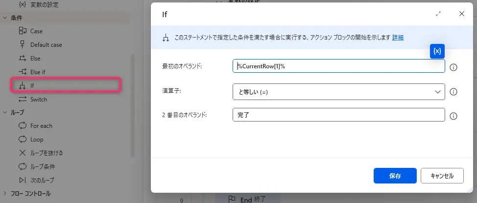 次に、IF 条件で ExcelのB 列の値(ステータス)をチェックします。