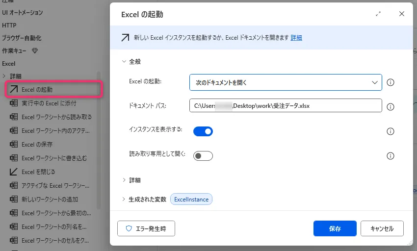 読み取るデータが入っているExcelファイルを指定します。