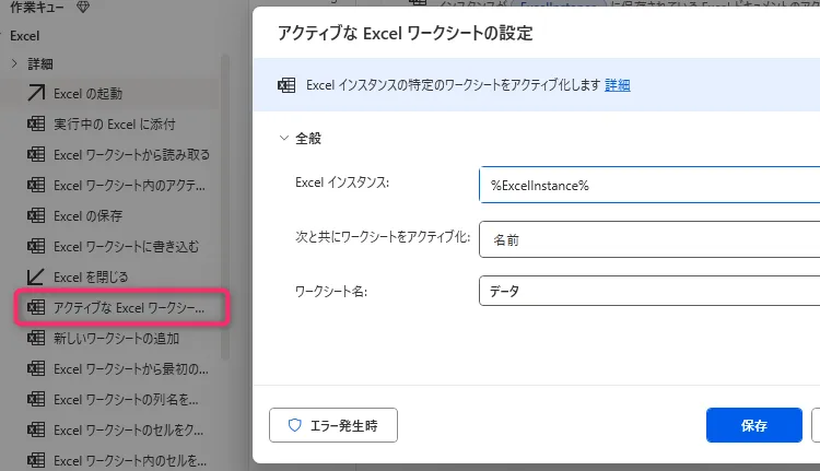2. 「アクティブなExcelワークシートの設定」