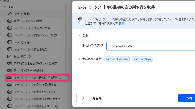 3. 「Excel ワークシートから最初の空の列や行を取得」