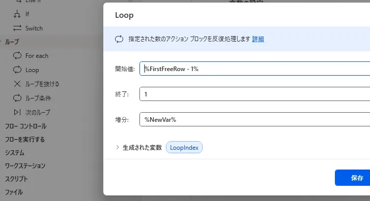 「FirstFreeRow – 1」 から 「1」 まで、%NewVar% を使ってループ処理を行います。