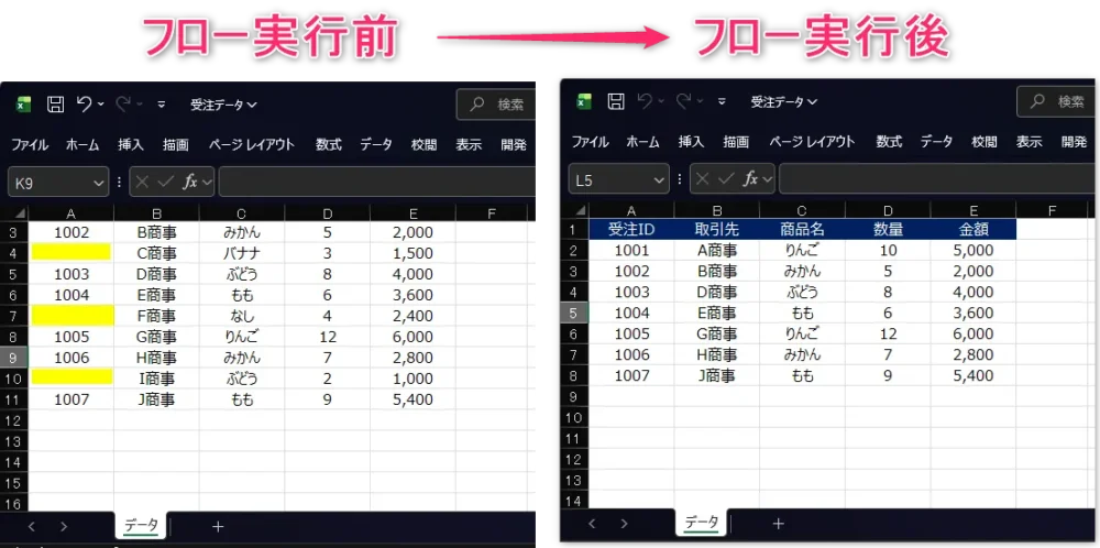 A列の「受注ID」が空の行だけを自動で削除する フローを作成します。