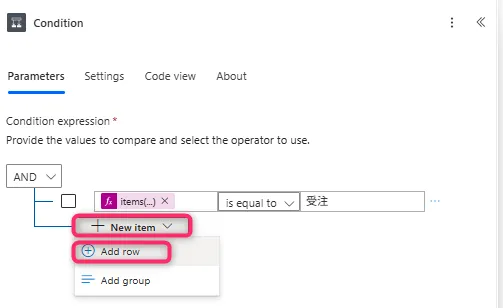 12. 「New item」>「add row」をクリックして、条件を追加します。