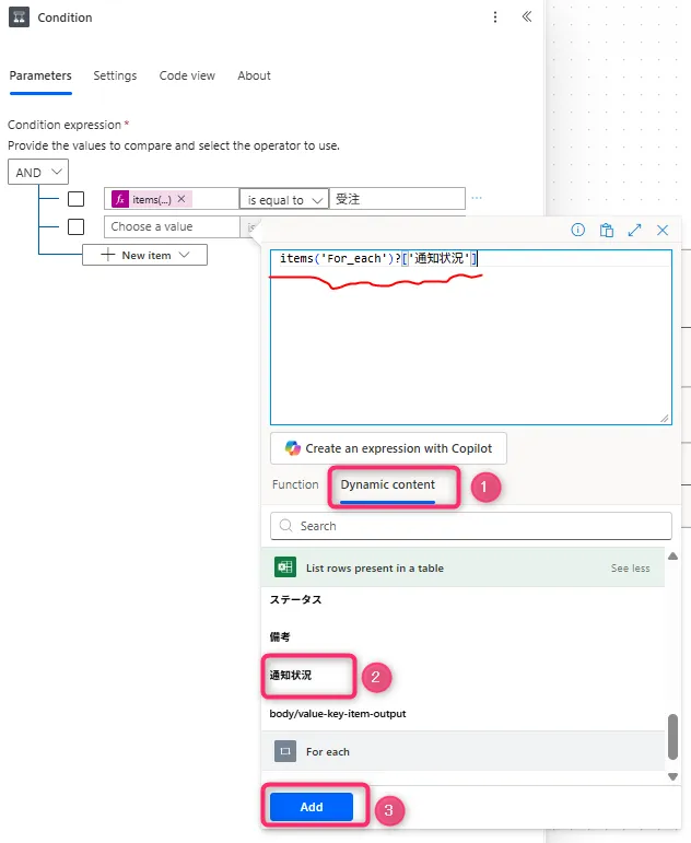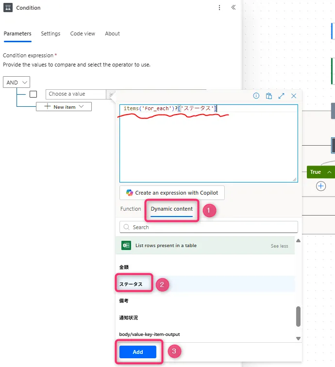 11. 「Dynamic content」をクリックし、Excelの列名「ステータス」を選択してから「add」をクリック