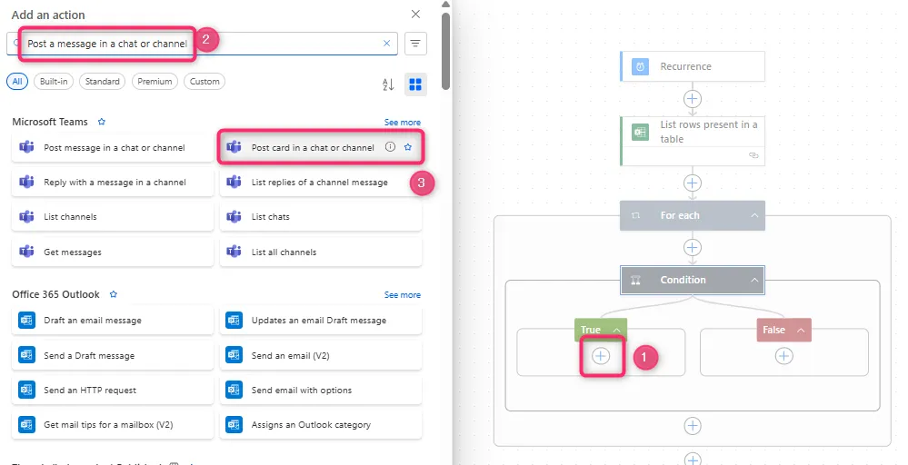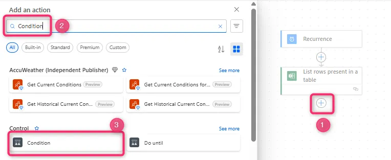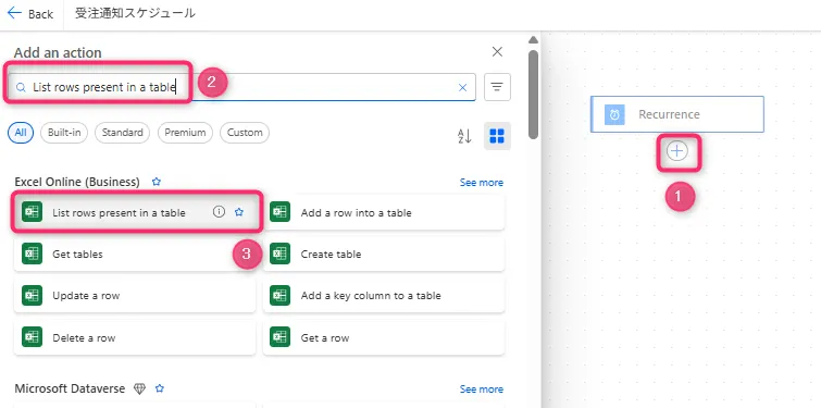 7. 「+」ボタンをクリックして、「List rows present in a table」で検索して選択