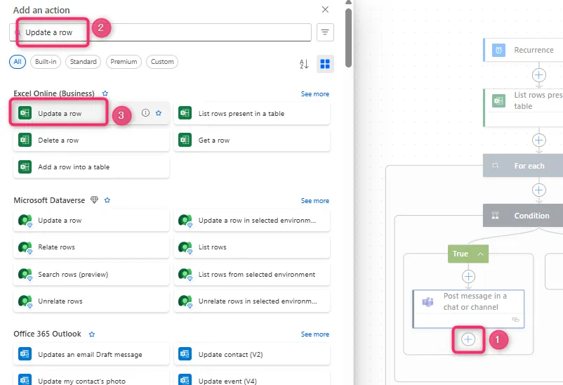 15. 「+」ボタンをクリックして、「Update a row」で検索して選択