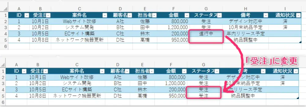 1. ID3、ID4の 「ステータス」を「受注」に変更してみます。