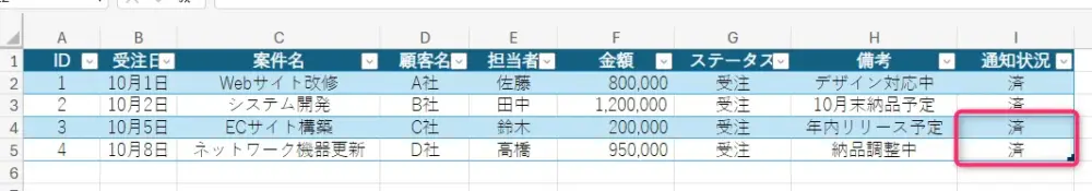 これで、Teamsチャット通知した行の「通知状況」列に ”済” が入ります。