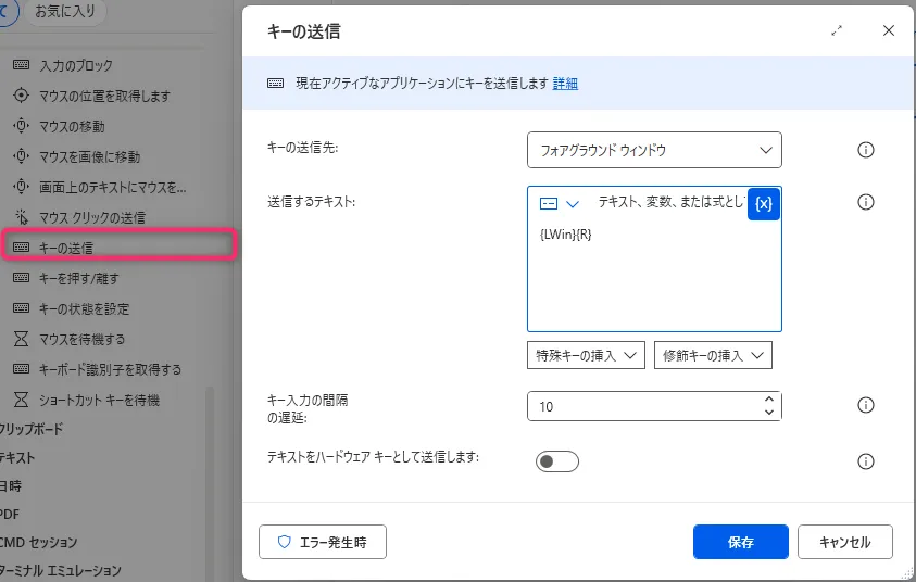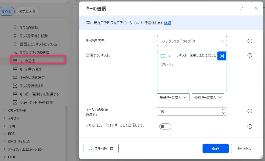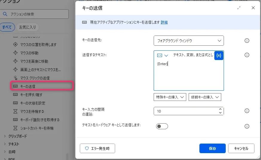 6. 「キーの送信」 → {Enter}