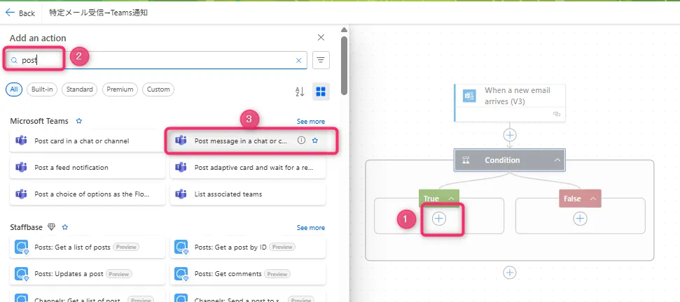 9. 「+」マークをクリックして、「post」を検索して、「Post a message in a chat or channel」選択します。