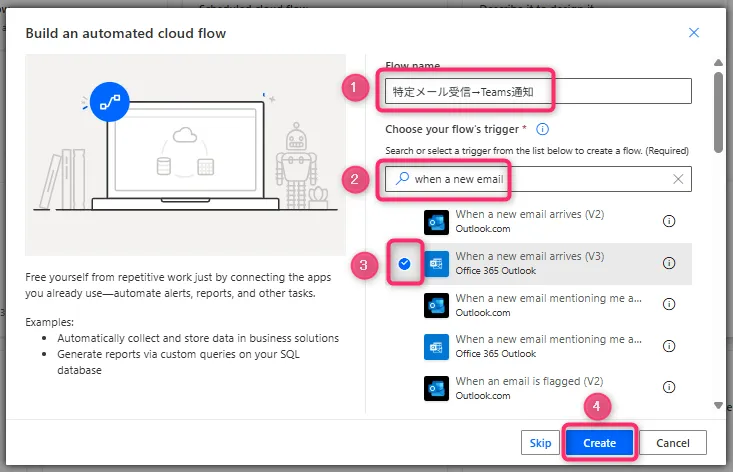 ③ 候補が表示されるので、「When a new email arrives (V3)」 にチェックを入れる