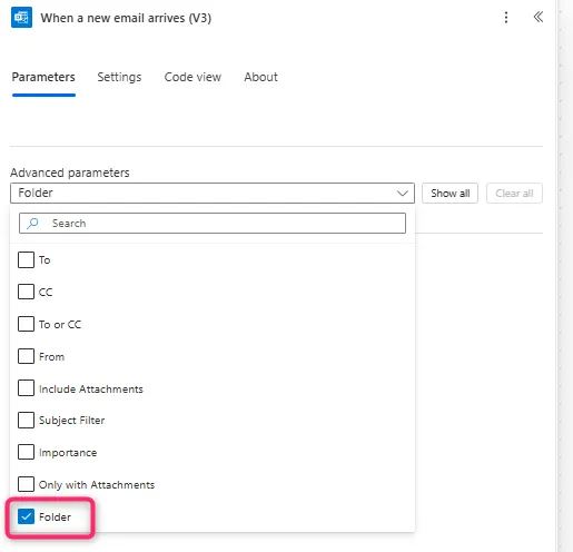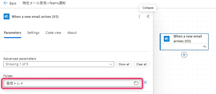 6. どのフォルダに受信したメールについて自動化フローを適用するか設定します。