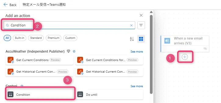 7. 「+」マークをクリックして、「Condition」を検索して選択します。