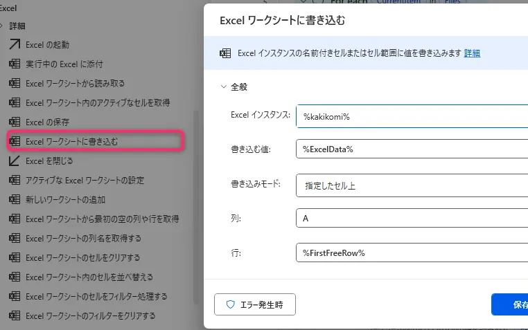10. 「Excelワークシートに書き込み」