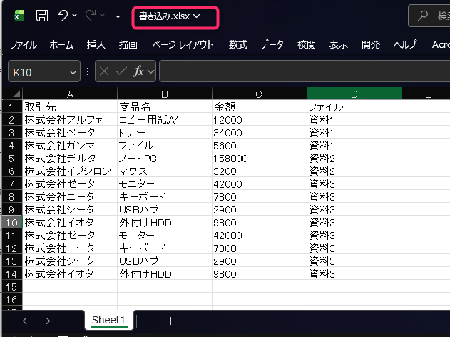 データを書き込むための Excel ファイルを開きます。