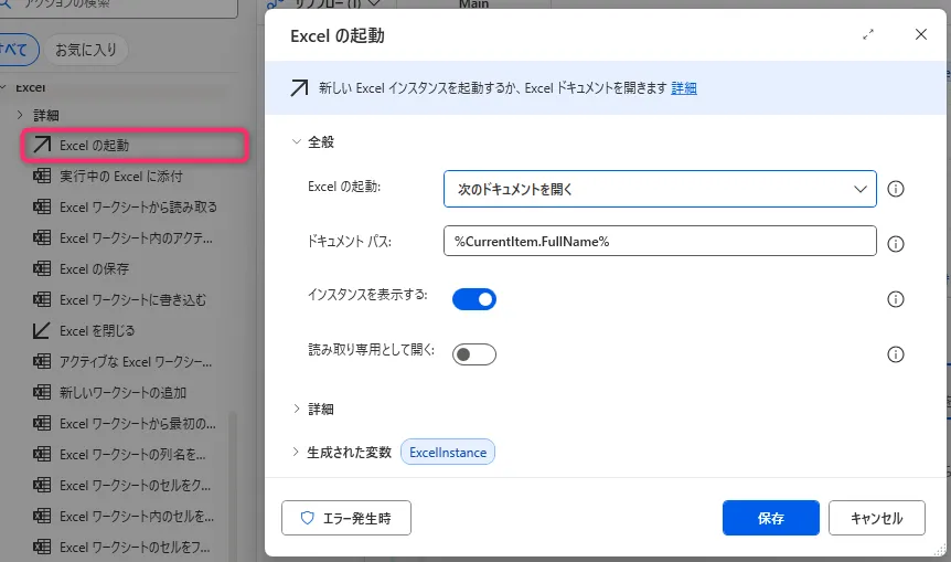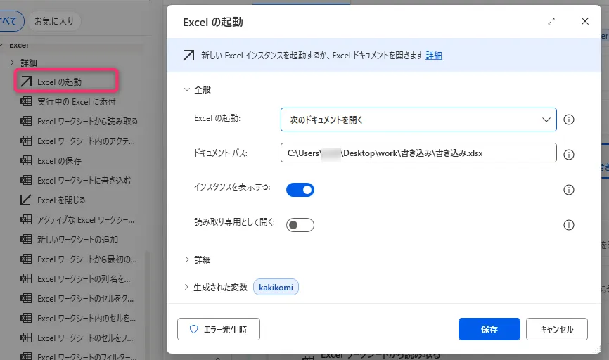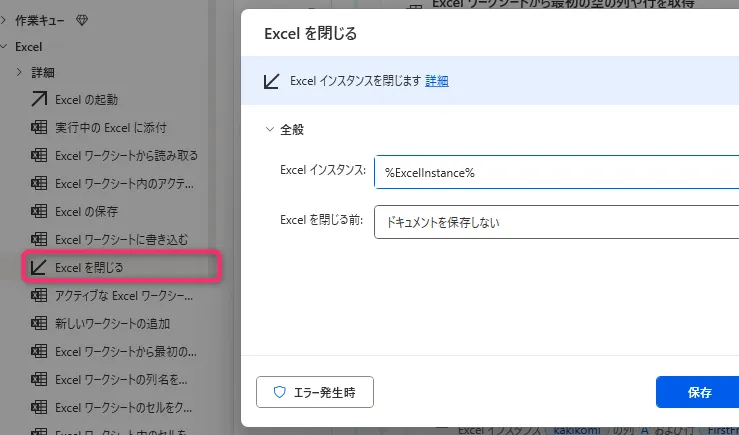 処理の最後に 「Excel の保存」 や 「Excel を閉じる」 アクションを追加してください。