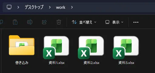 「work」フォルダの中に、Excelファイルが3つあります。
