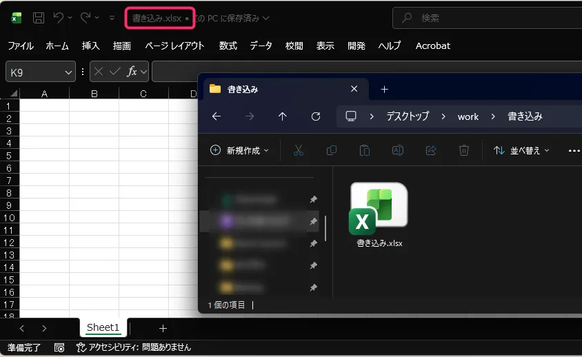 「書き込み」フォルダの中に「書き込み用.xlsx」を作成しておきます。