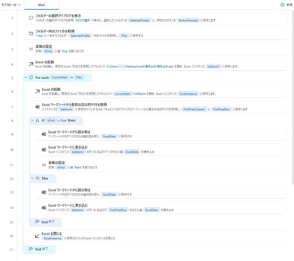 フォルダー内の Excel ファイルの数だけ、この中の処理が繰り返されます。