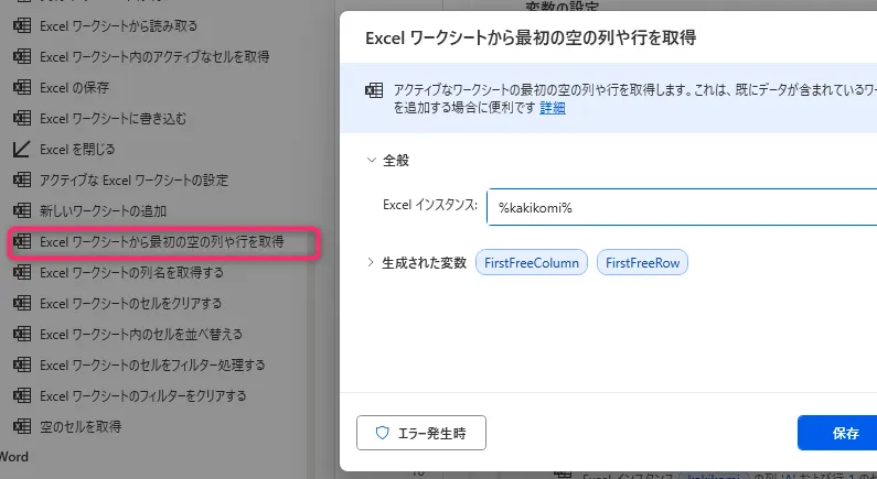 7. 「Excelワークシートから最初の空の列や行を取得」
