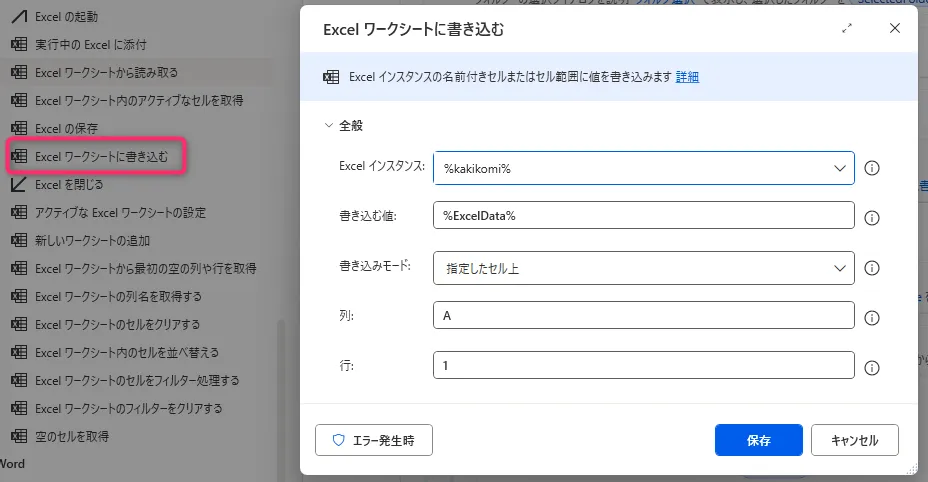 14. 「Excelワークシートに書き込み」