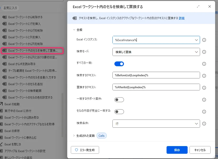 8. IFの中に「Excelワークシート内のセルを検索して置換する」
