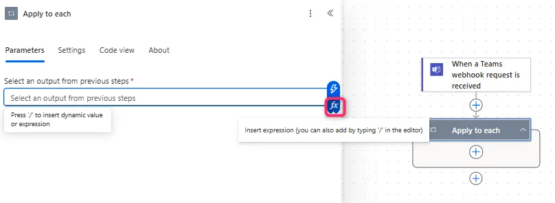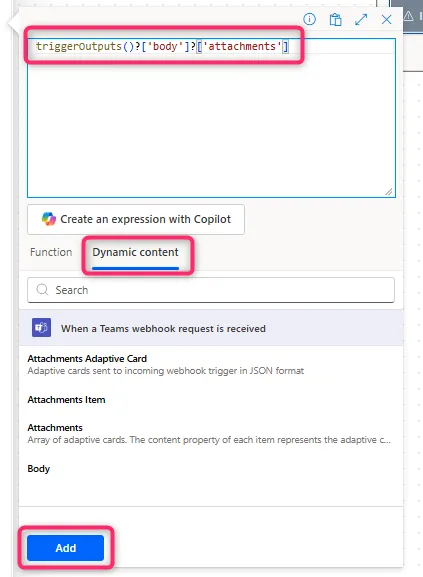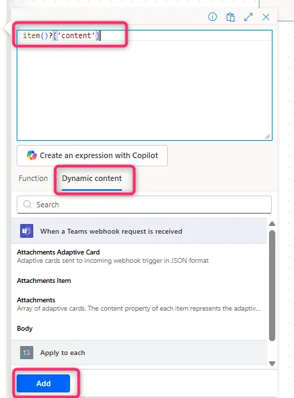 15. 「Dynamic content」を選択し、入力ボックスに以下コードを入力して「Add」