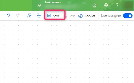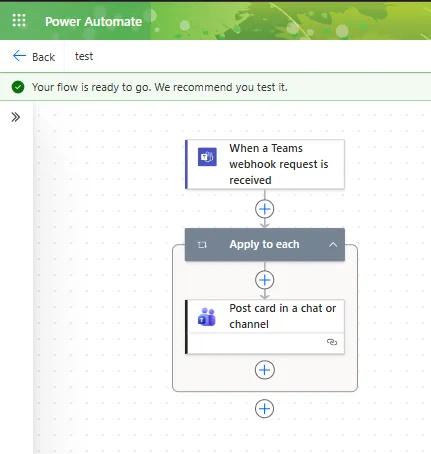 画面左上でフローを任意の名前に変えるとよい(今回は例として “test” とした)
