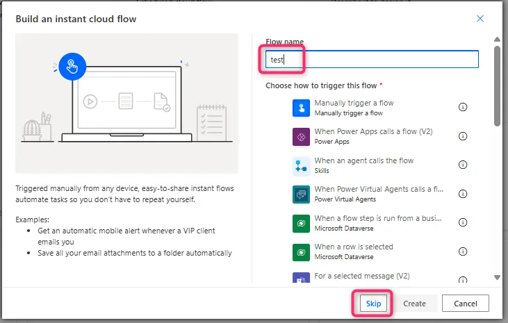 4. 「Flow name」に任意の名前を入力し、「Skip」